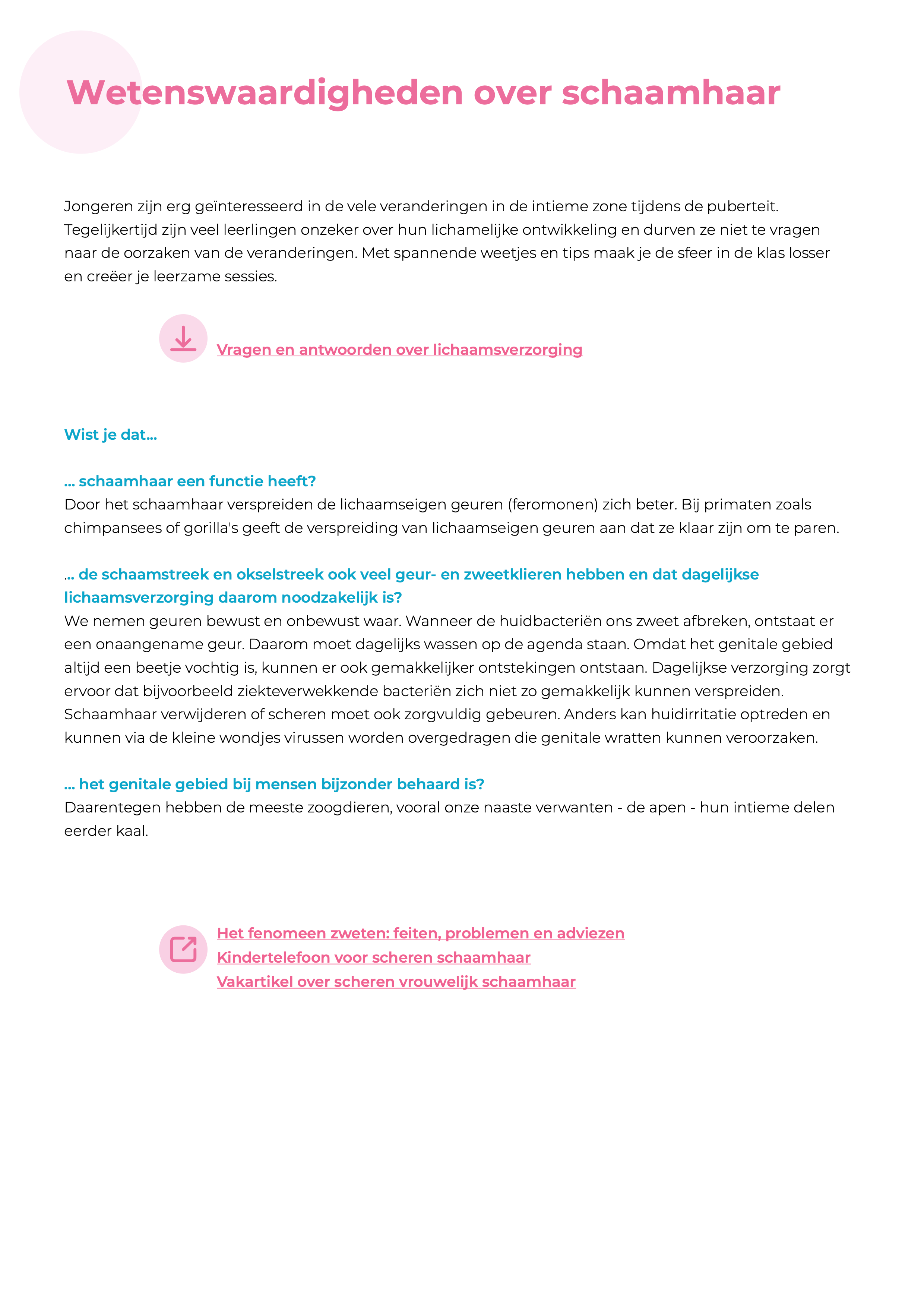 De lichamelijke veranderingen die de puberteit met zich meebrengt, vormen dan ook een essentieel hoofdstuk in de seksuele voorlichting. Dit vakgebied biedt diverse lesmaterialen die gaan over het lichaam, de ontwikkeling ervan en hygiëne.